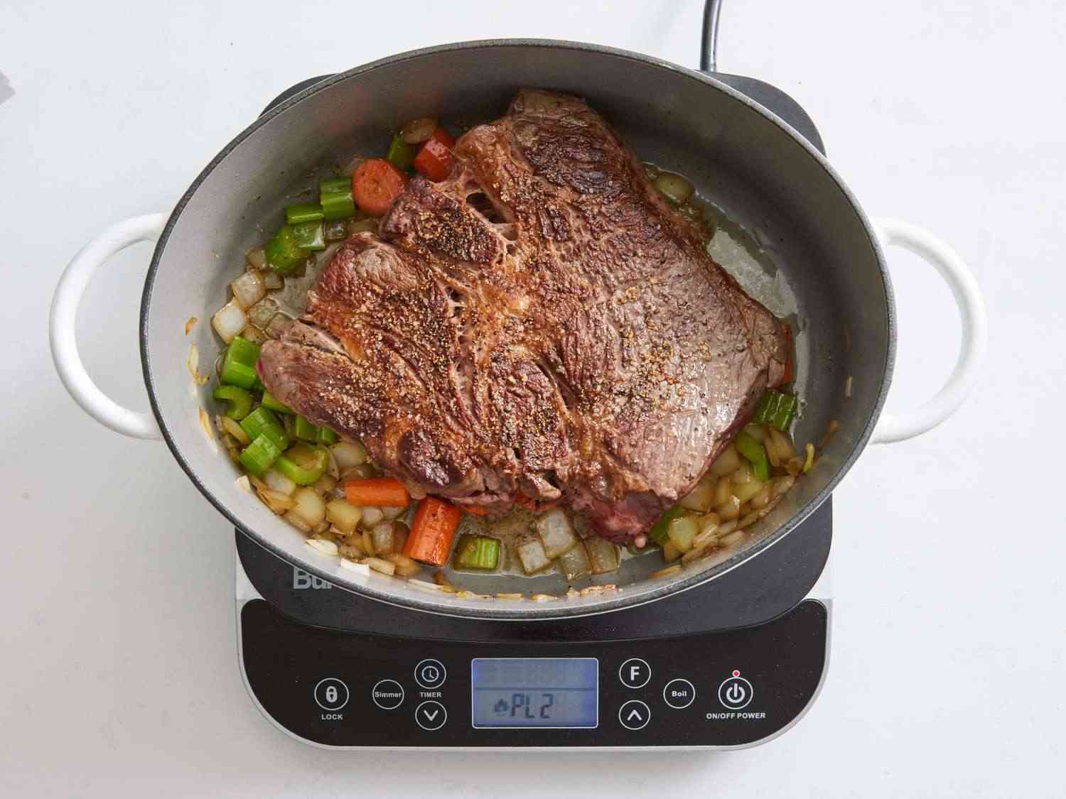 - Step 2:Heat vegetable oil into a large oven-safe pot over medium-high heat. Season chuck roast with salt and black pepper. Dotdash Meredith Food Studios