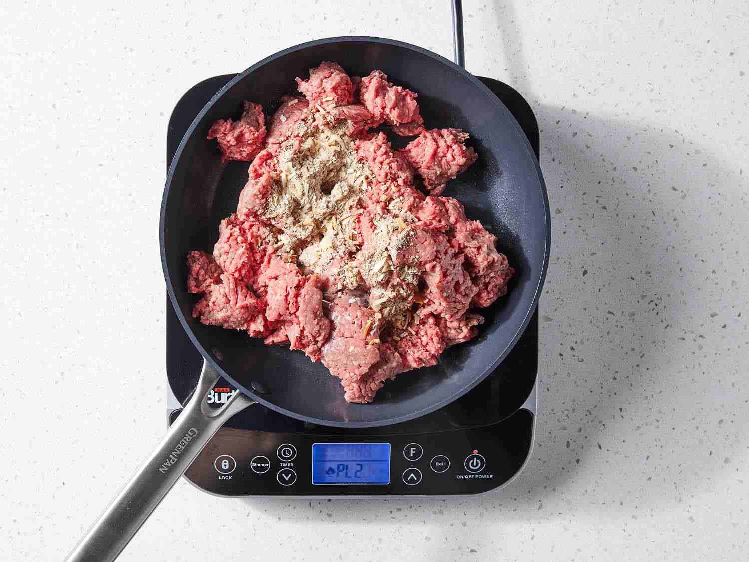 - Step 3:Mix together ground beef and onion soup mix in a large skillet; cook and stir over medium-high heat until beef is crumbly and evenly browned, 5 to 7 minutes. Drain and discard any excess grease. Dotdash Meredith Food Studios